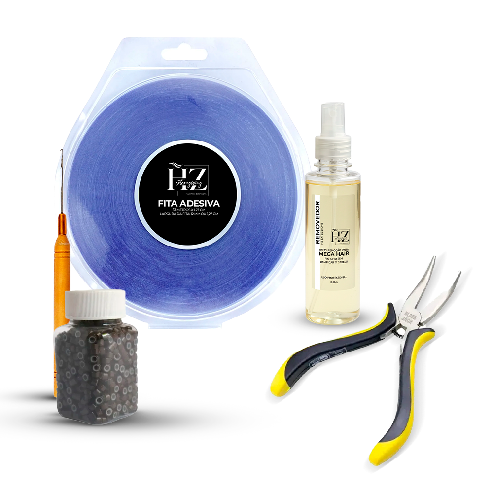 1 Removedor 250ml / 1 Alicate / 1 Fita 12mt / 1 Agulha Microlink / 1 Pct Microlink Silicone.